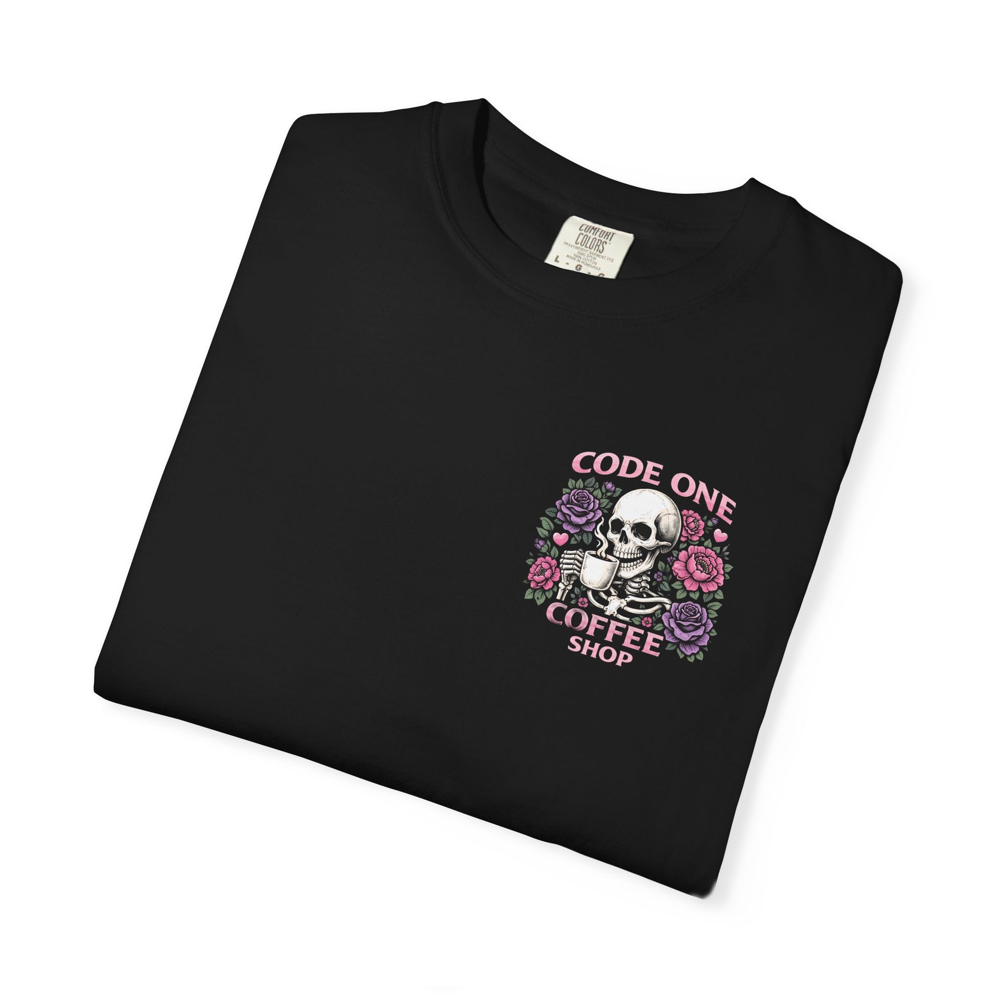 This garment-dyed tee carries a lived-in weight and a quiet attitude. The soft, washed-black cotton feels like an old favorite from the first wear, while the compact chest graphic — a skull framed by coffee roses and the words “Code One Coffee Bar” — hints at late-night shifts, early sunrise brews, and the crew who run on strong coffee and darker humor. It sits loosely across the shoulders and drapes with relaxed confidence, the heavy 6.1 oz cotton giving structure without stiffness. Wear it for slow mornings at the coffee bar, quick runs into town, or when you want something that reads a little rebellious but still comfortable enough for every day.