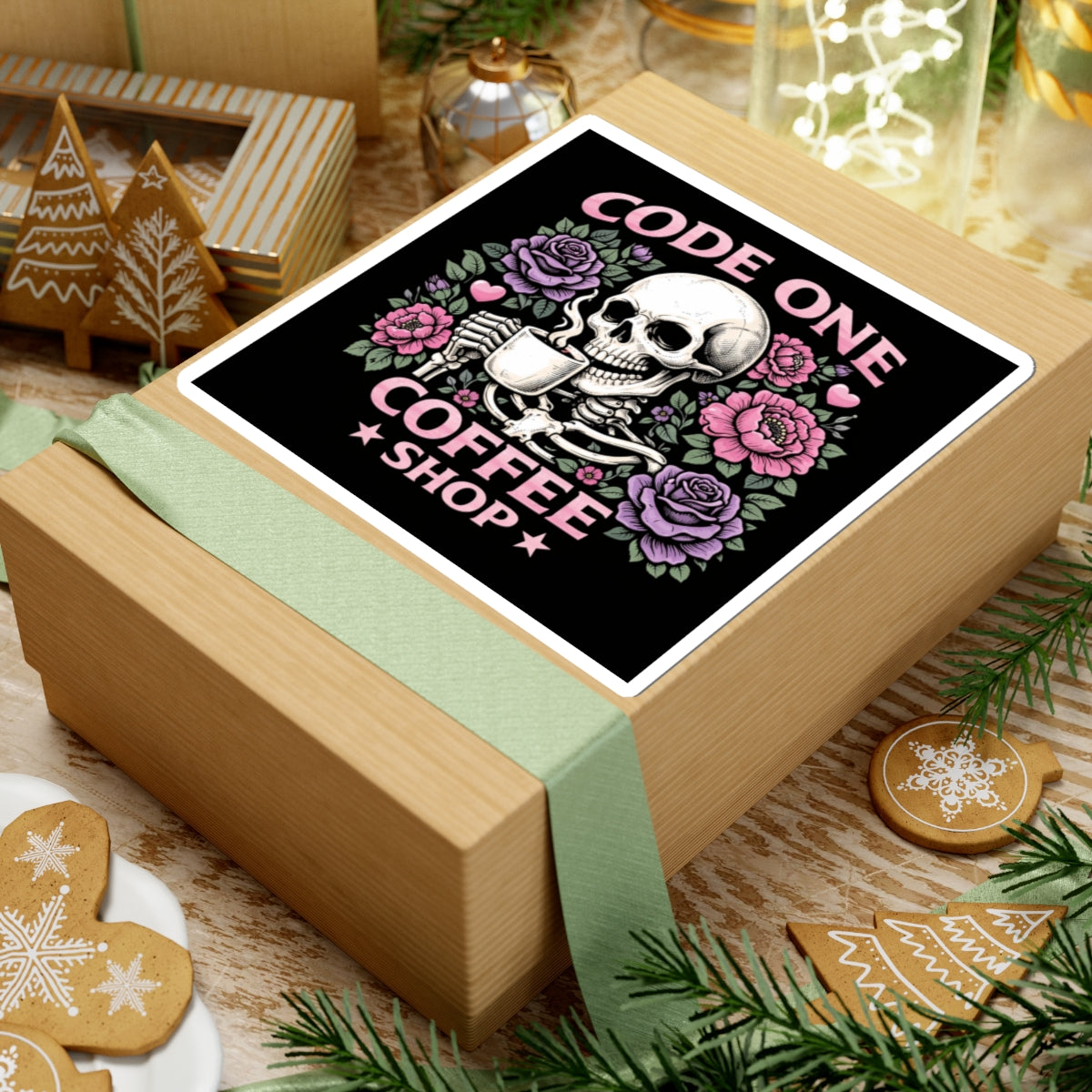 A glossy kiss-cut vinyl sticker featuring a cheeky skull cradling a steaming coffee mug, framed by lush pink and purple roses and bold retro lettering that reads “CODE ONE COFFEE SHOP.” The high-contrast artwork pops against a deep black background, with eco-solvent inks delivering saturated, long-lasting color. Designed for quick, bubble-free application on smooth surfaces like laptops, journals, and windows, this sticker adds a touch of dark whimsy and floral edge to everyday gear. Available in white or transparent backing and multiple sizes to suit your setup.