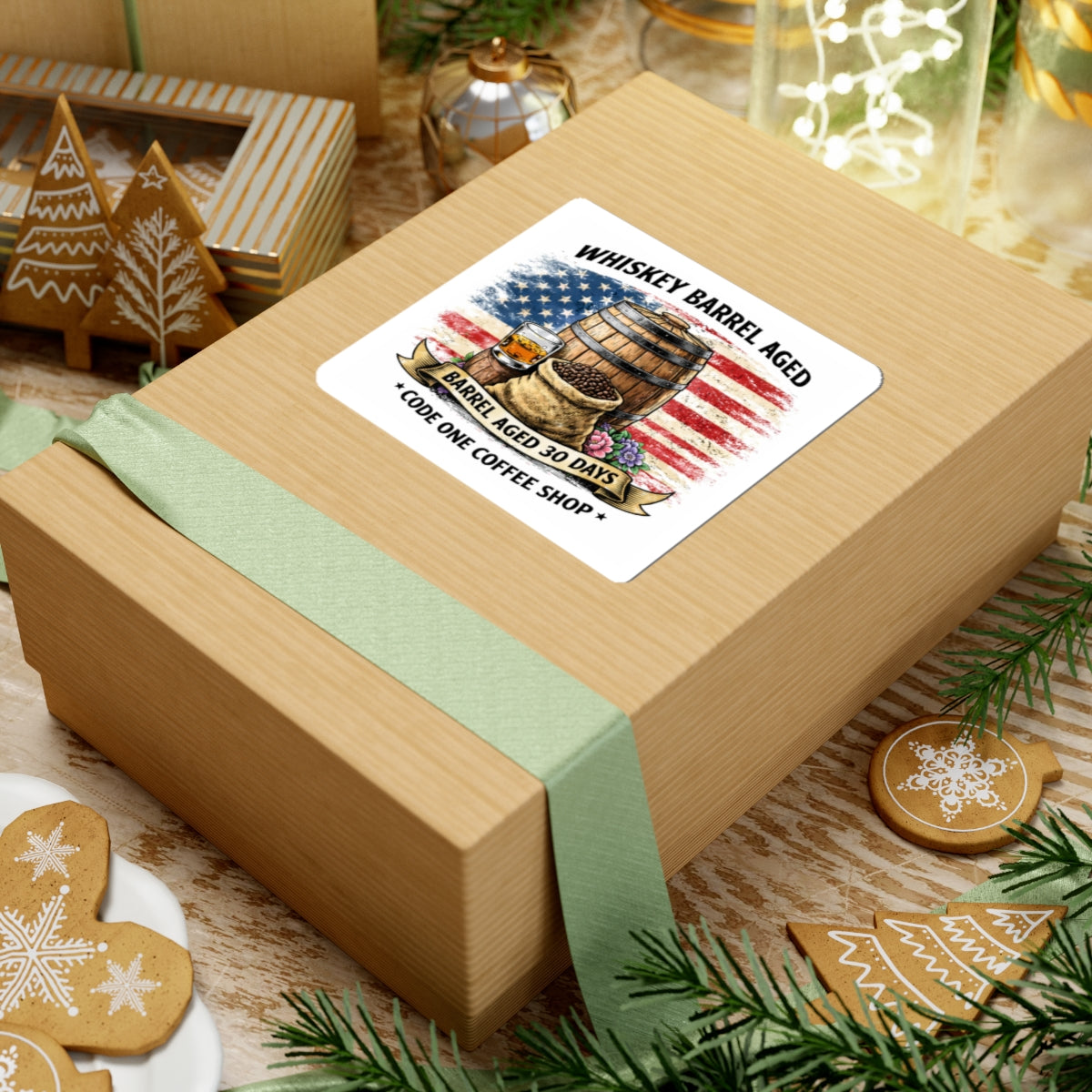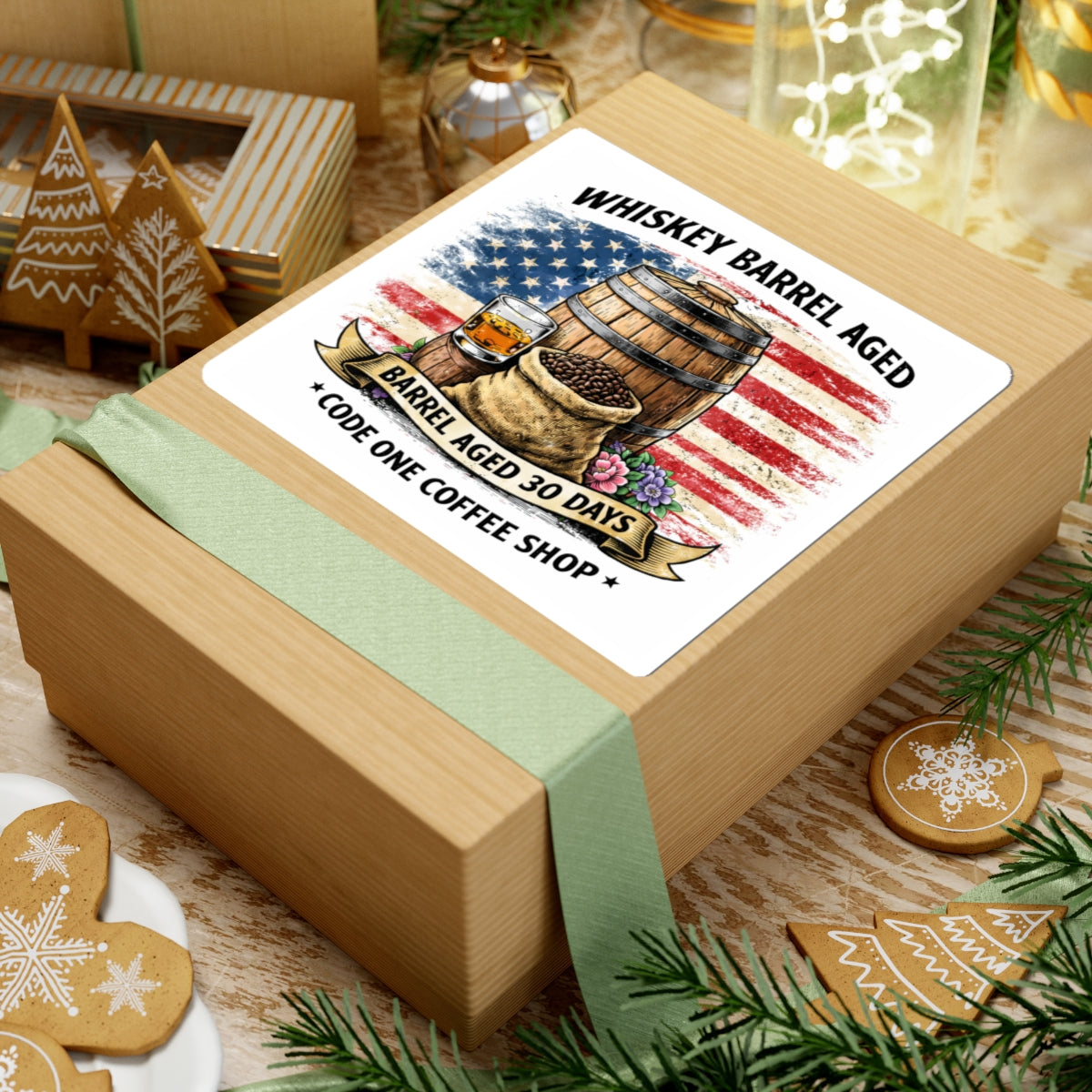 This glossy kiss-cut sticker brings a warm, handcrafted vibe to any smooth surface. A vintage whiskey barrel sits front and center, surrounded by coffee beans, a neat pour of amber liquor, and a faded American flag backdrop — all rendered in bright, eco-solvent inks that pop against the glossy finish. Place it on a laptop, journal, or shop window to share a little rustic coffeehouse personality: the artwork tells a short story of barrel-aged flavor and slow craft, and the sticker’s durable vinyl and strong adhesive hold that feeling in place. Available in white or transparent backgrounds and multiple sizes, it slips on cleanly with a bubble-free application and stays looking sharp for years indoors.